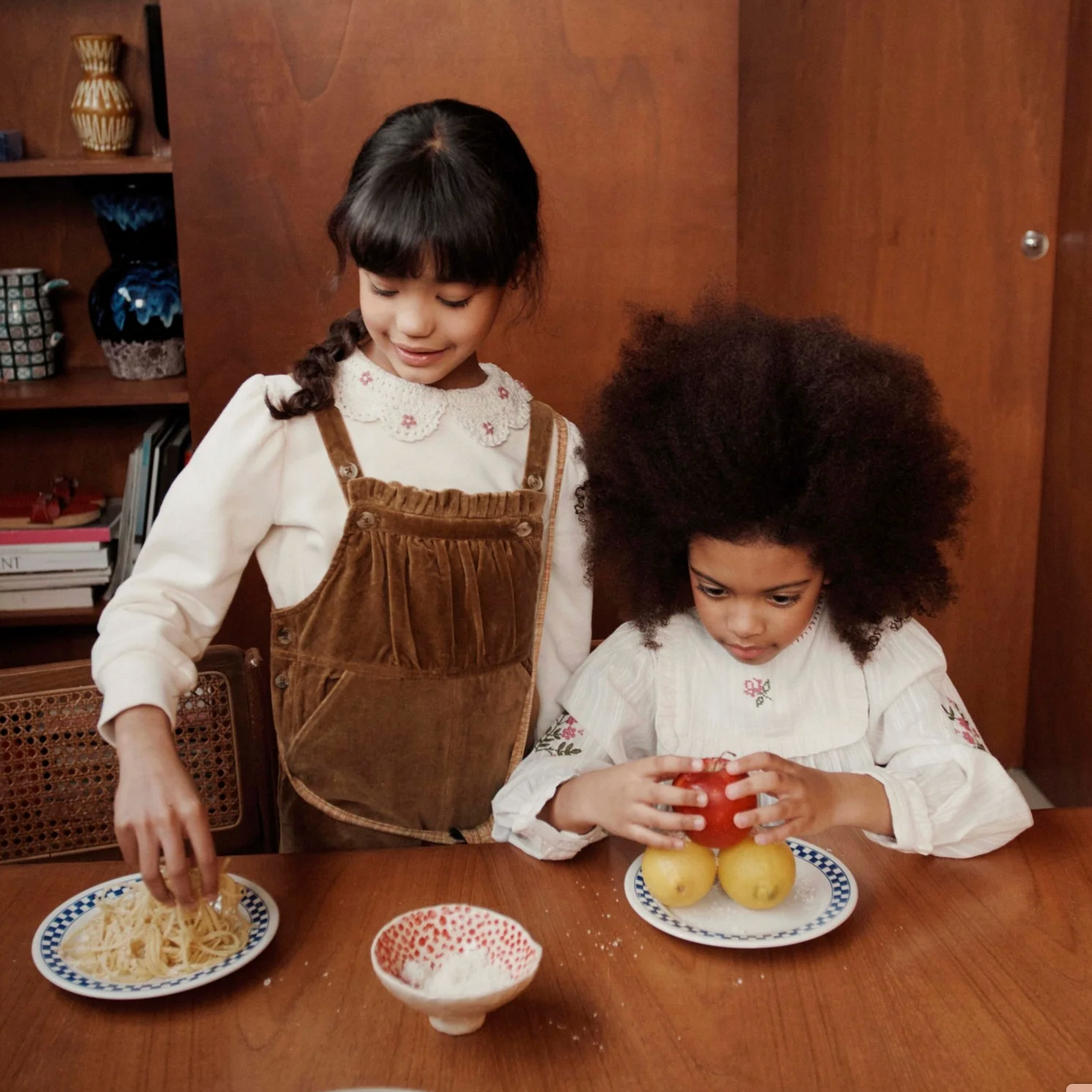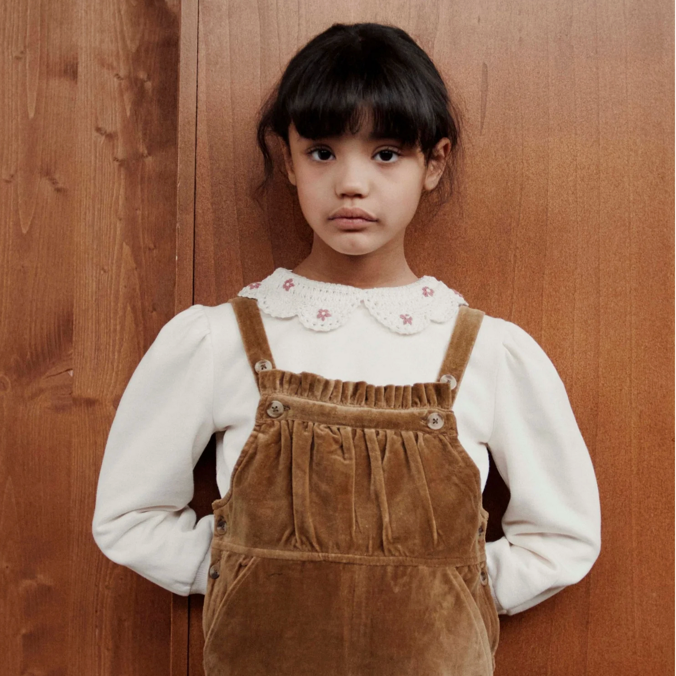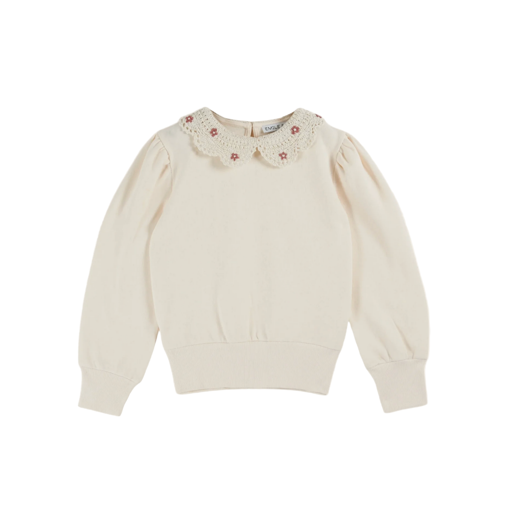 - Neckline is bordered by an ecru crochet collar dotted with hand-embroidered pink flowers
