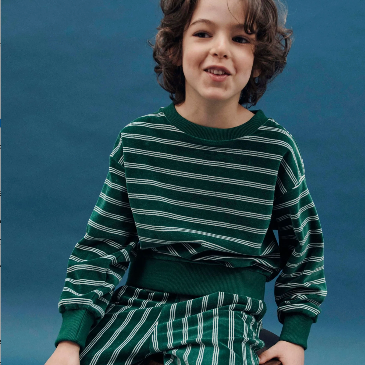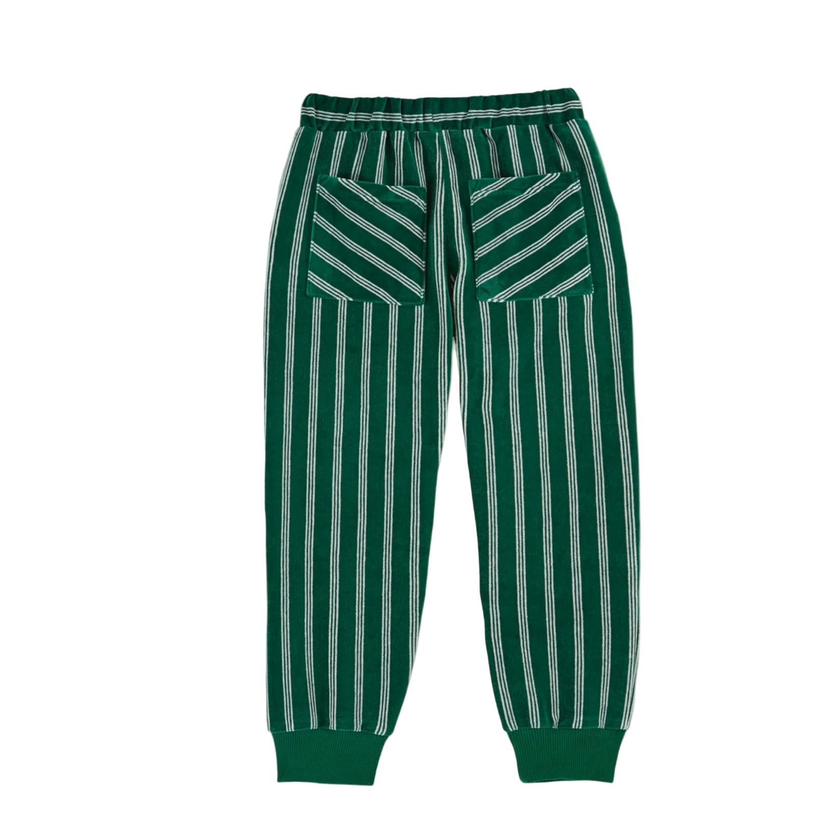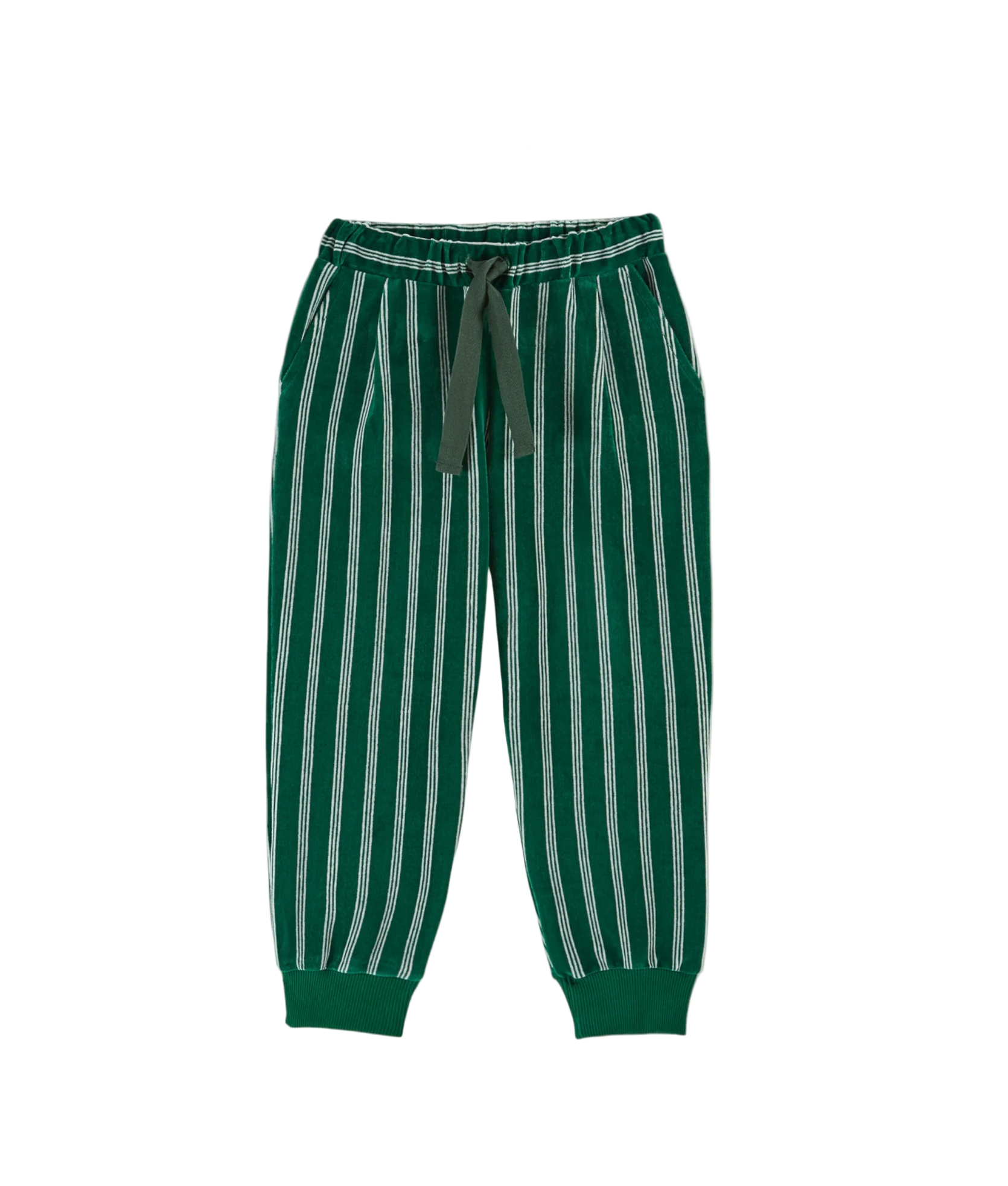 - Jogger in cotton and polyester velvet with white stripes on a green background