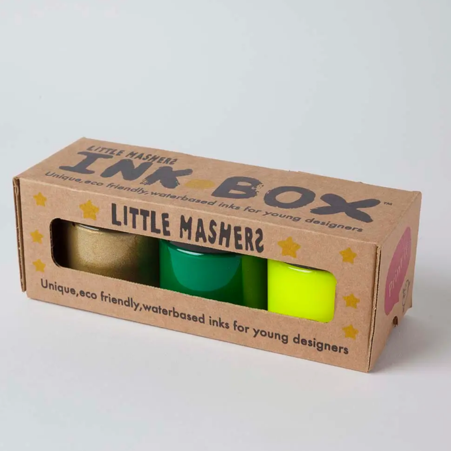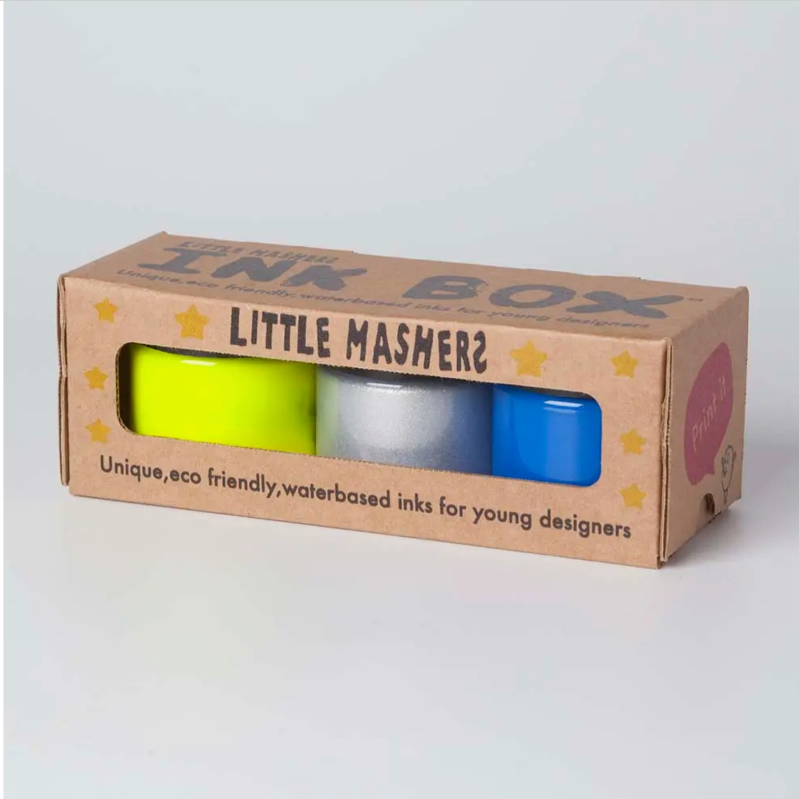 - Eco friendly water based fabric inks in blue, silver and neon yellow.
