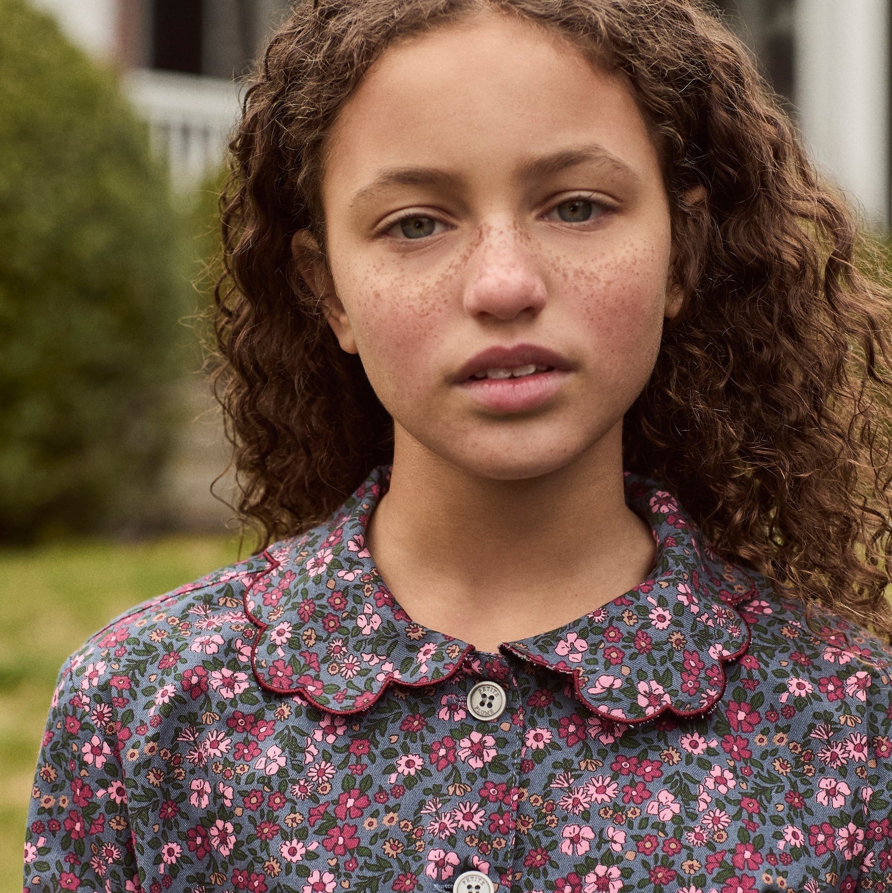- Scalloped details at the collar, wrists, and hems add a vintage flair to the twill design, which features logo buttons and pretty piping