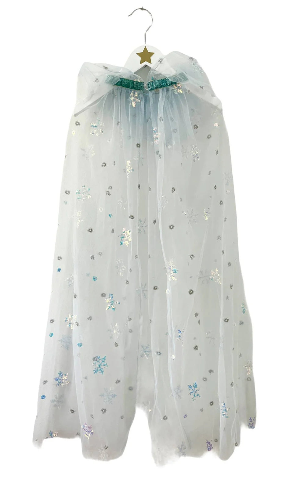- The Ice Princess cape is made of iridescent blue tulle and embroidered with star sequins