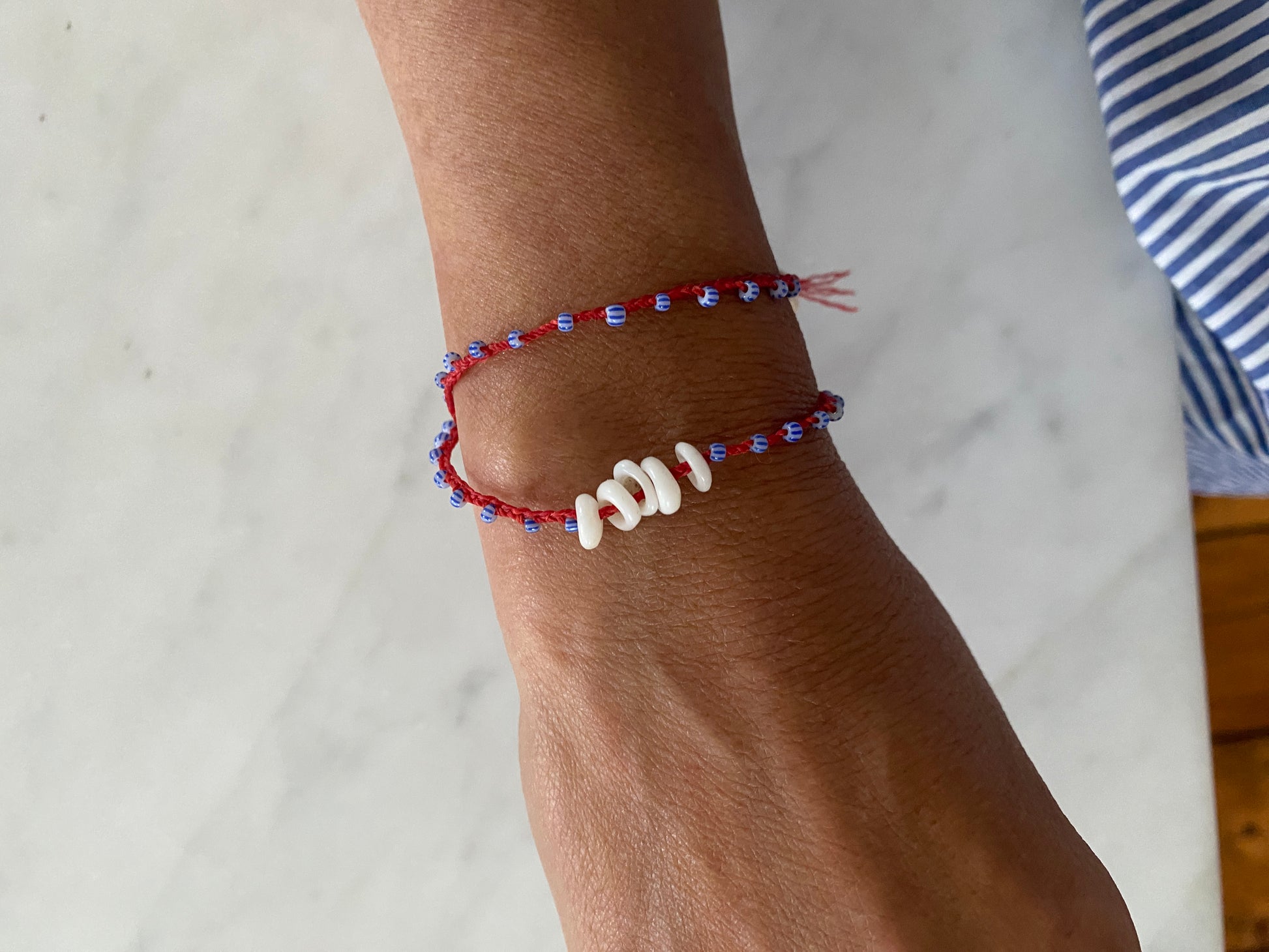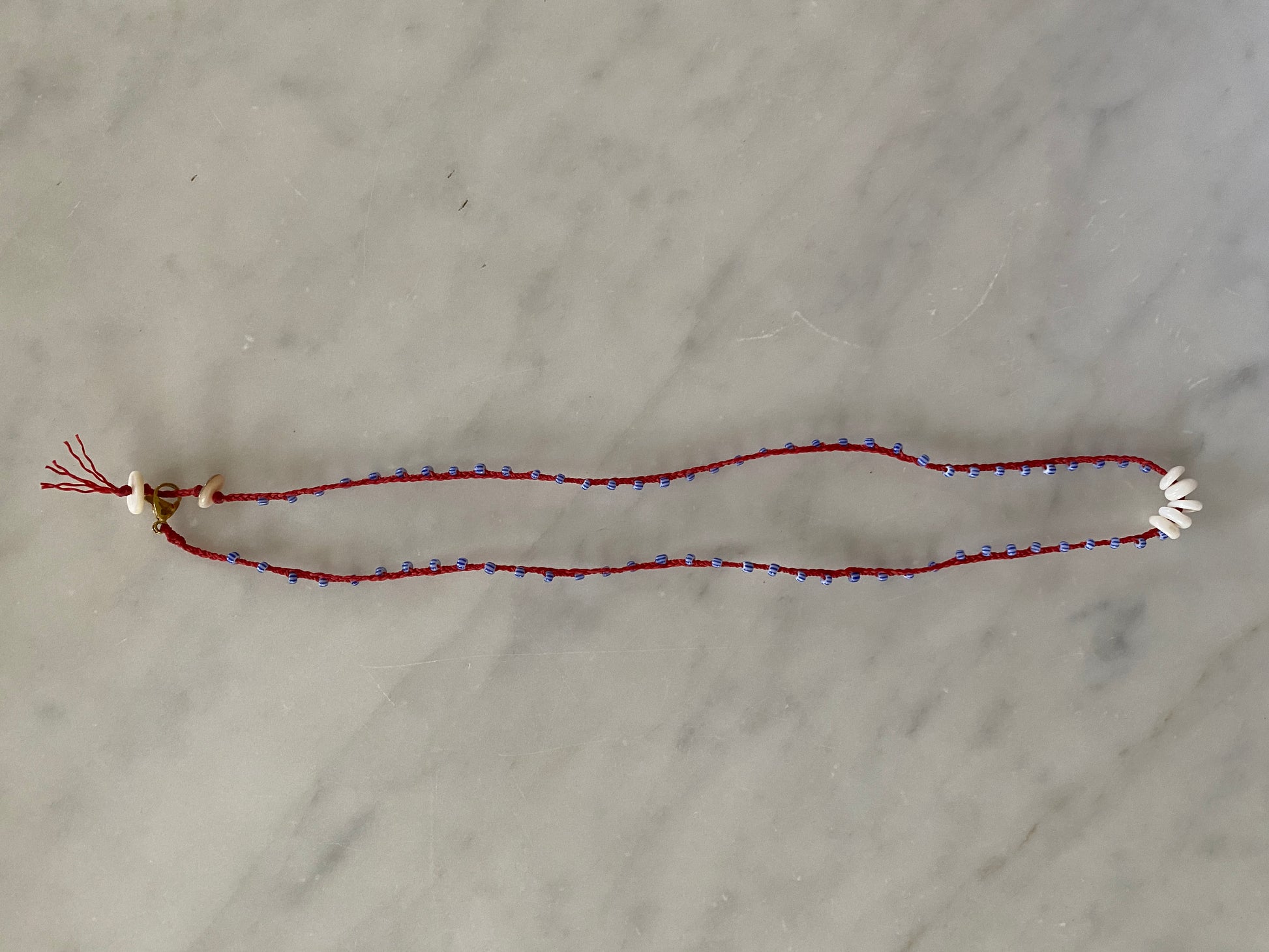 - Red sting with blue glass beads and puka shells or brown string with white glass beads and puka shells