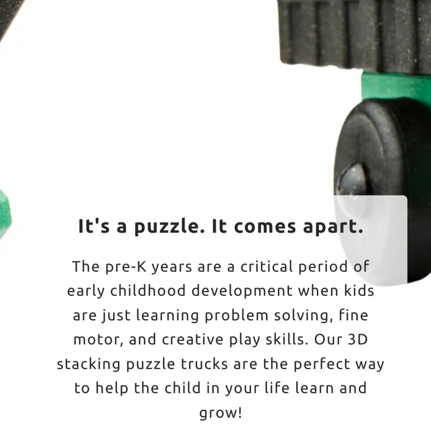 Think of a 3D puzzle that becomes a truck when assembled. Designed for small hands, the toys are made with a little bit of wiggle room so that kids with developing motor skills are not frustrated. Our toys are designed for kids aged three and up - just at the point where kids are outgrowing "baby" toys but aren't quite ready for the precision required for more complicated building toys. And parts from one truck can be mixed and matched with parts from the other trucks!