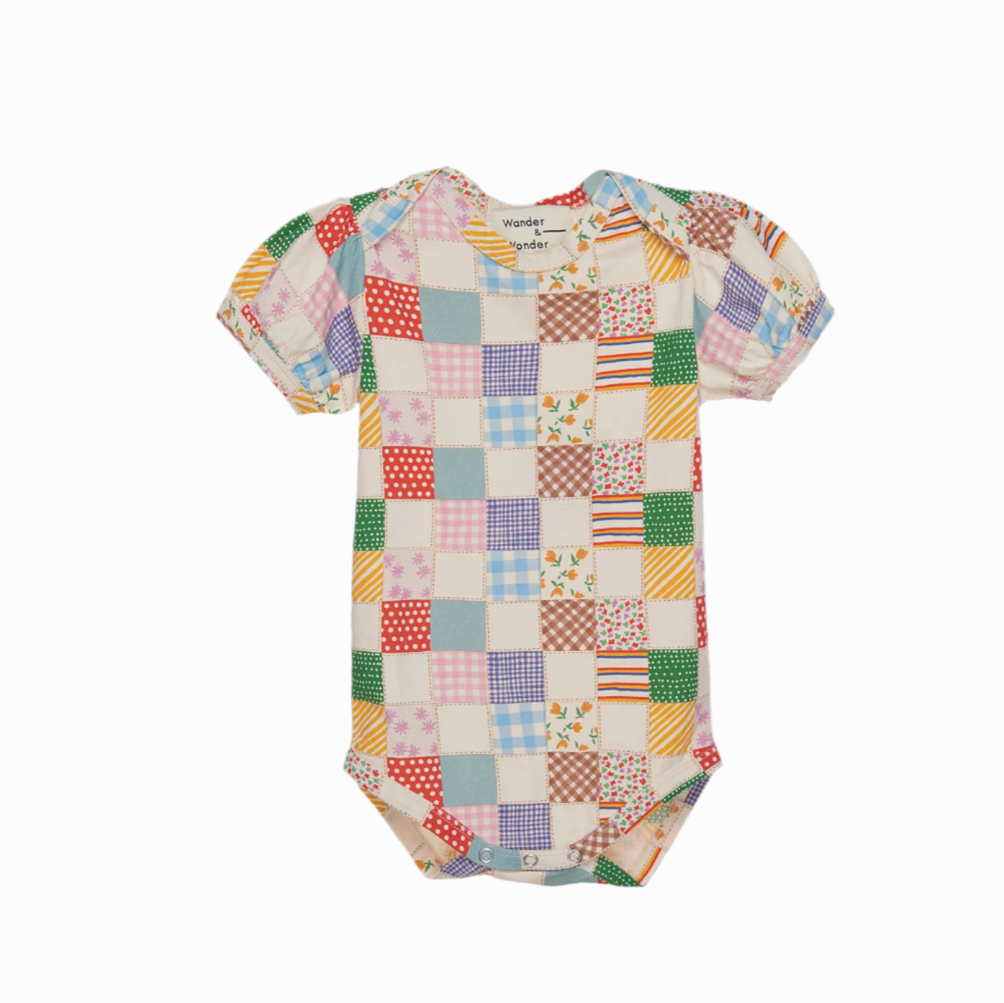 - Patchwork onsie with snaps at. bottom