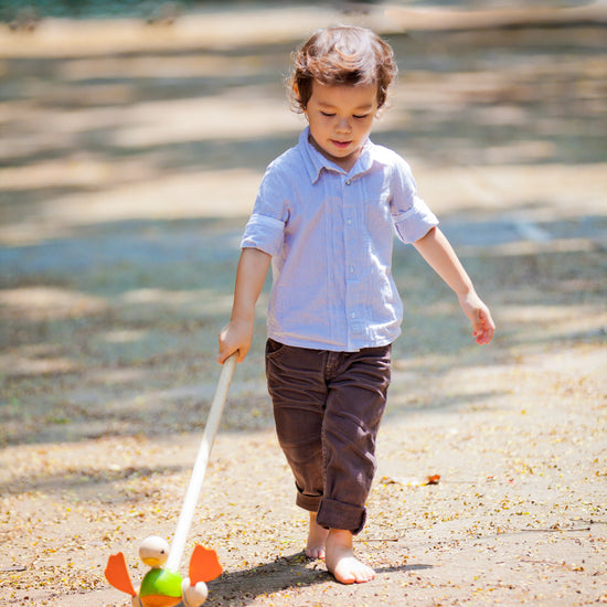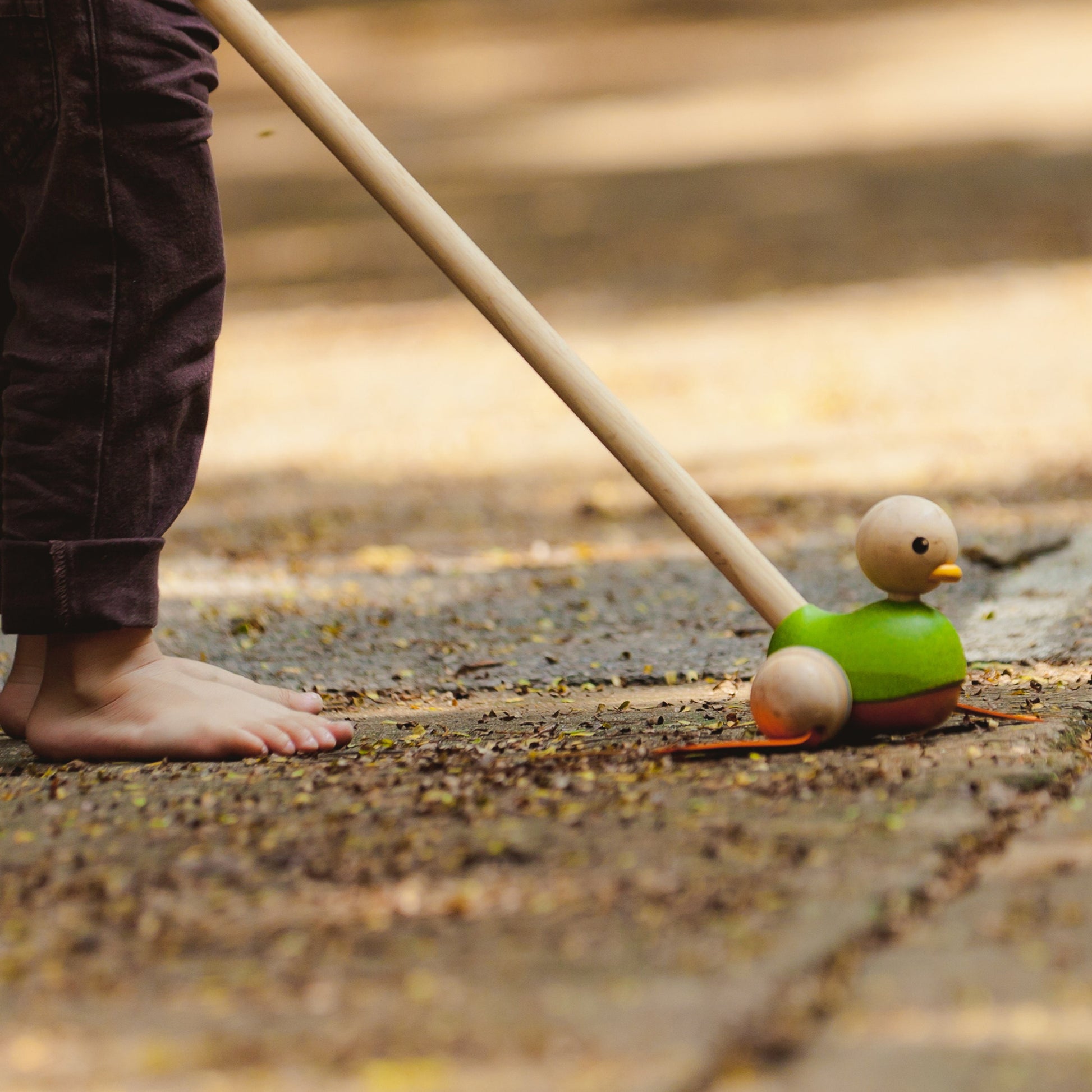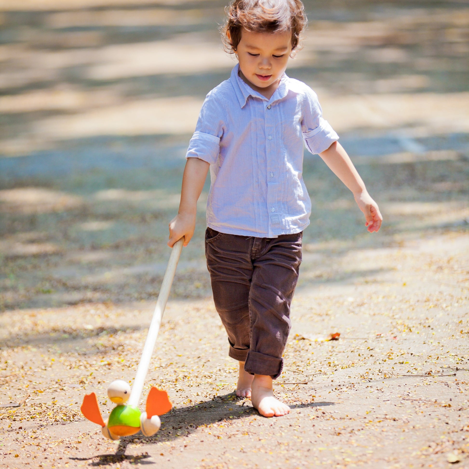 - Practice walking on your own and watch the duck's rubber feet flip-flop when the toy is pushed along