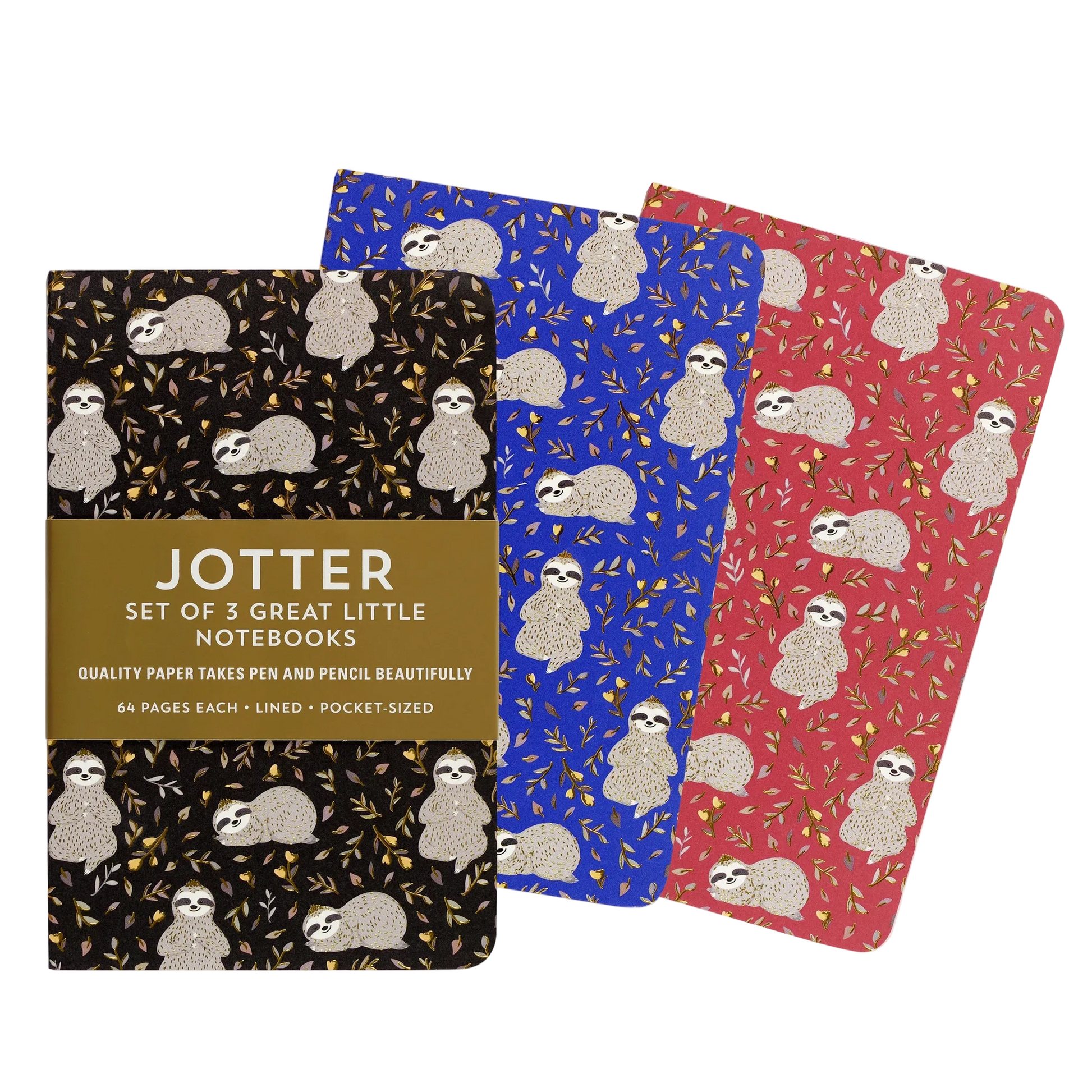 - Three different notebooks with adorable sloth covers in black, blue, and red.