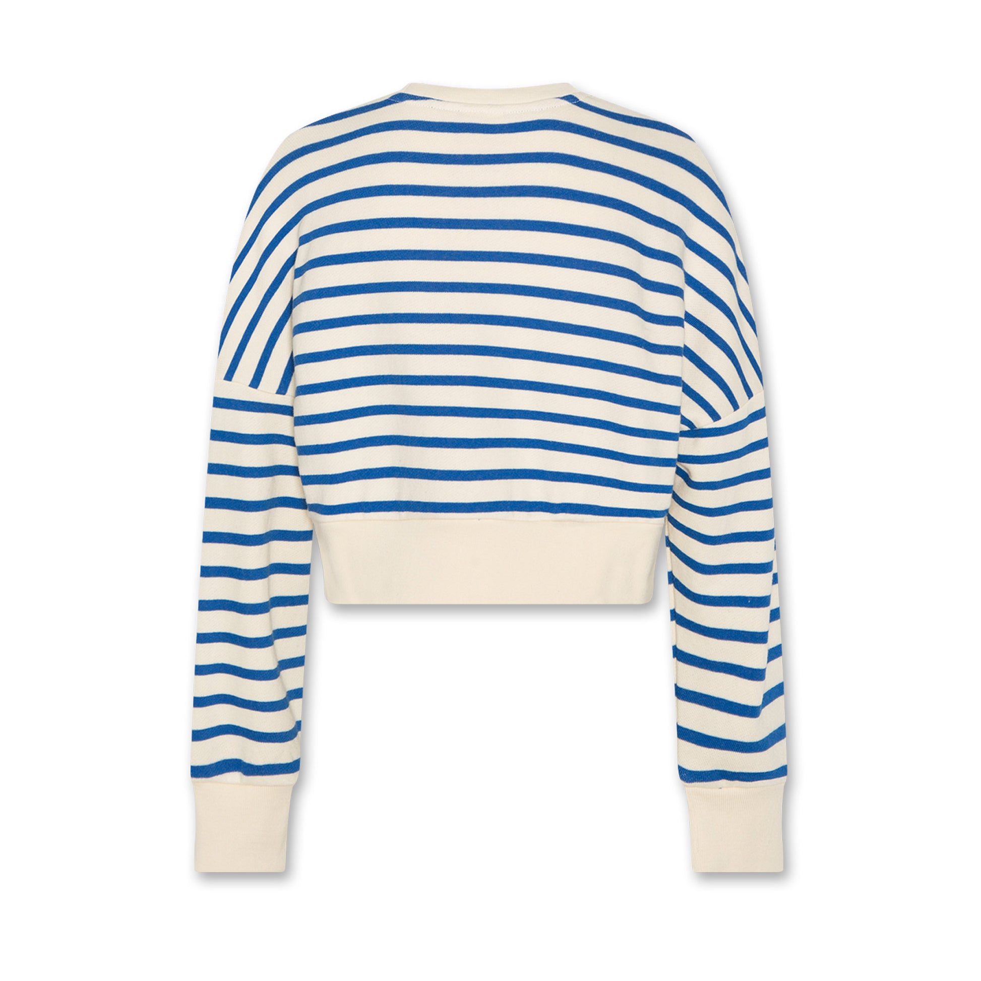 - Cropped, but not too cropped, blue striped sweatshirt