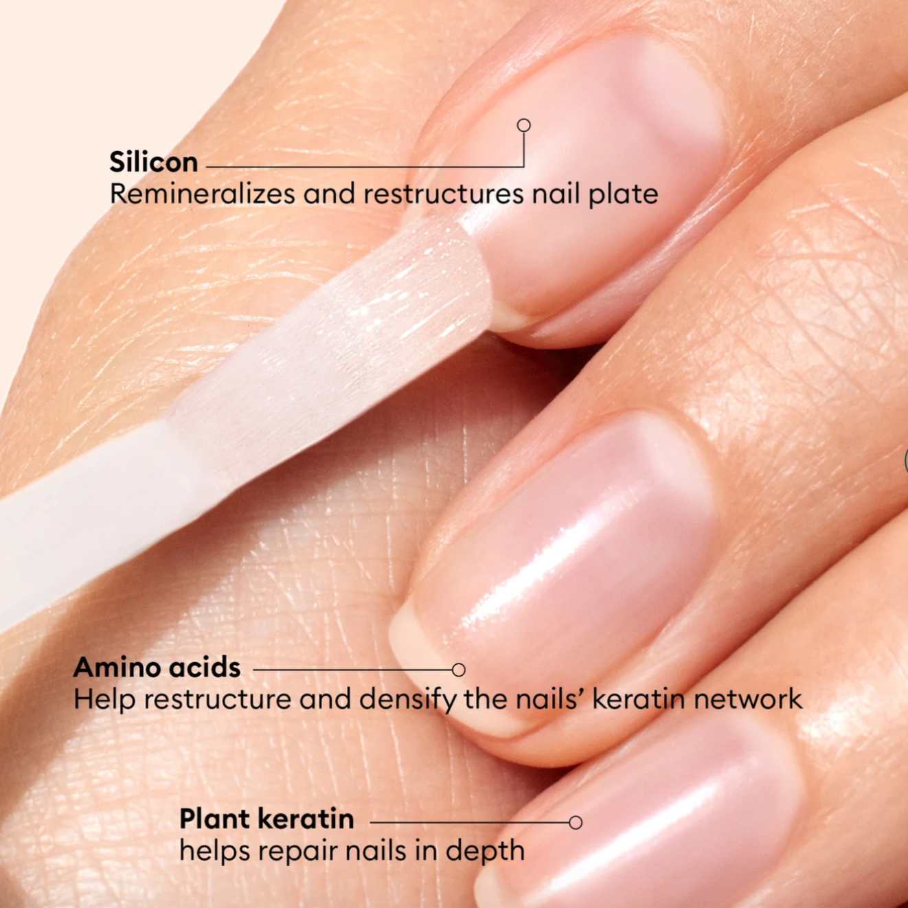 - A transparent vegan formula enriched with active ingredients to restore and strengthen the nail plate, for healthy nails in no time!