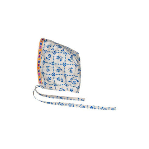 - An all-over printed cotton poplin baby hat with colored braid and adjustable tie