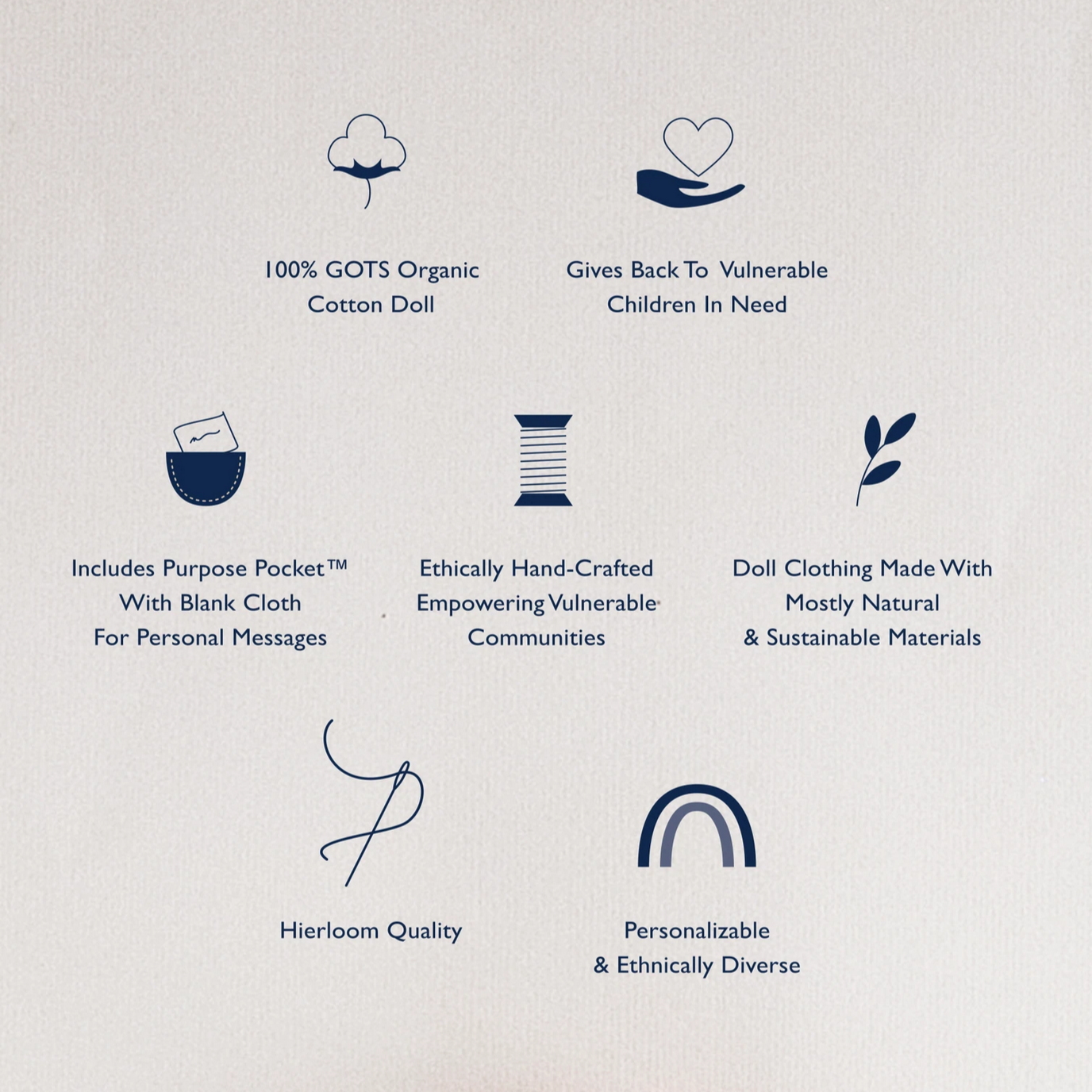 - Materials: Doll made of GOTS organic cotton, sustainable felt and stuffed with poly-fill. The clothing is made of linen & nylon.