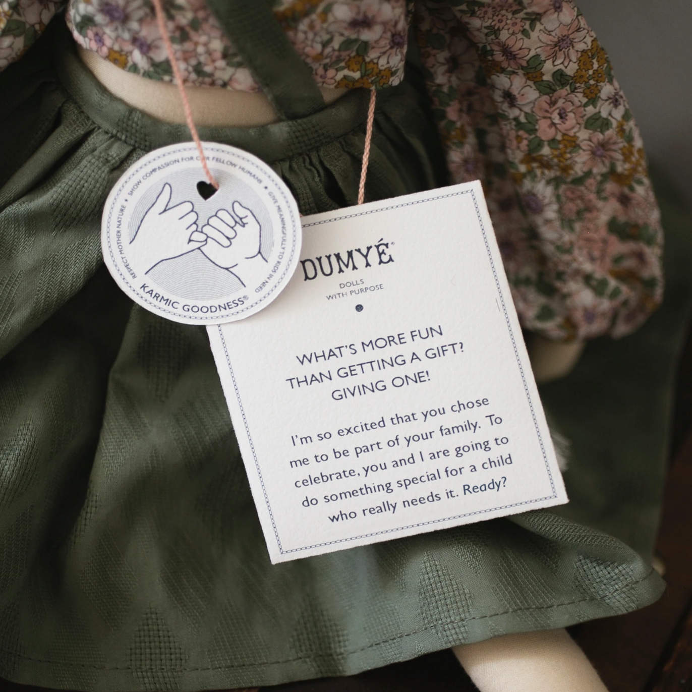 - Dumyé dolls are on a mission to bring love into the lives of all children, which is why Léya comes with a Dumyé Giving Card. This card holds a unique code allowing you to trace how we have made a positive difference in the life of a child in need, just by bringing Léya home with you. Pretty awesome right?!