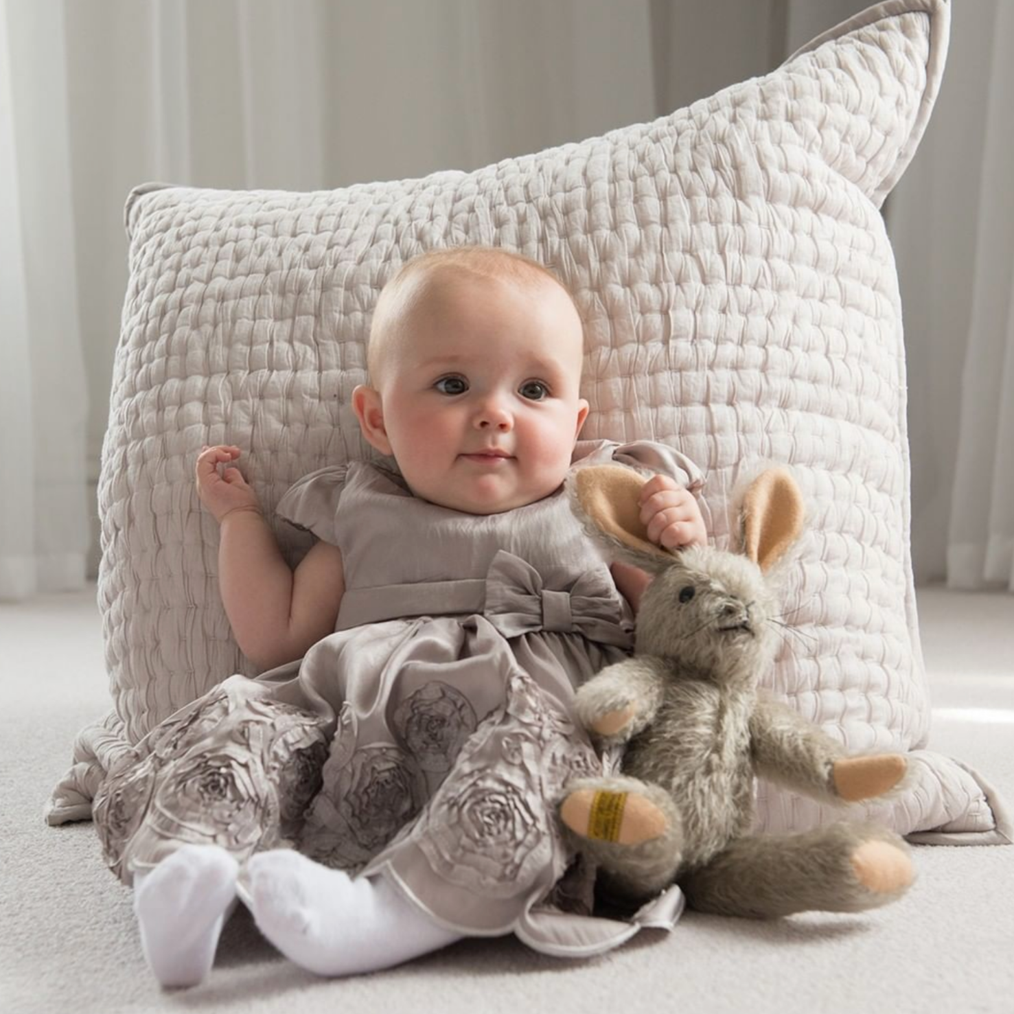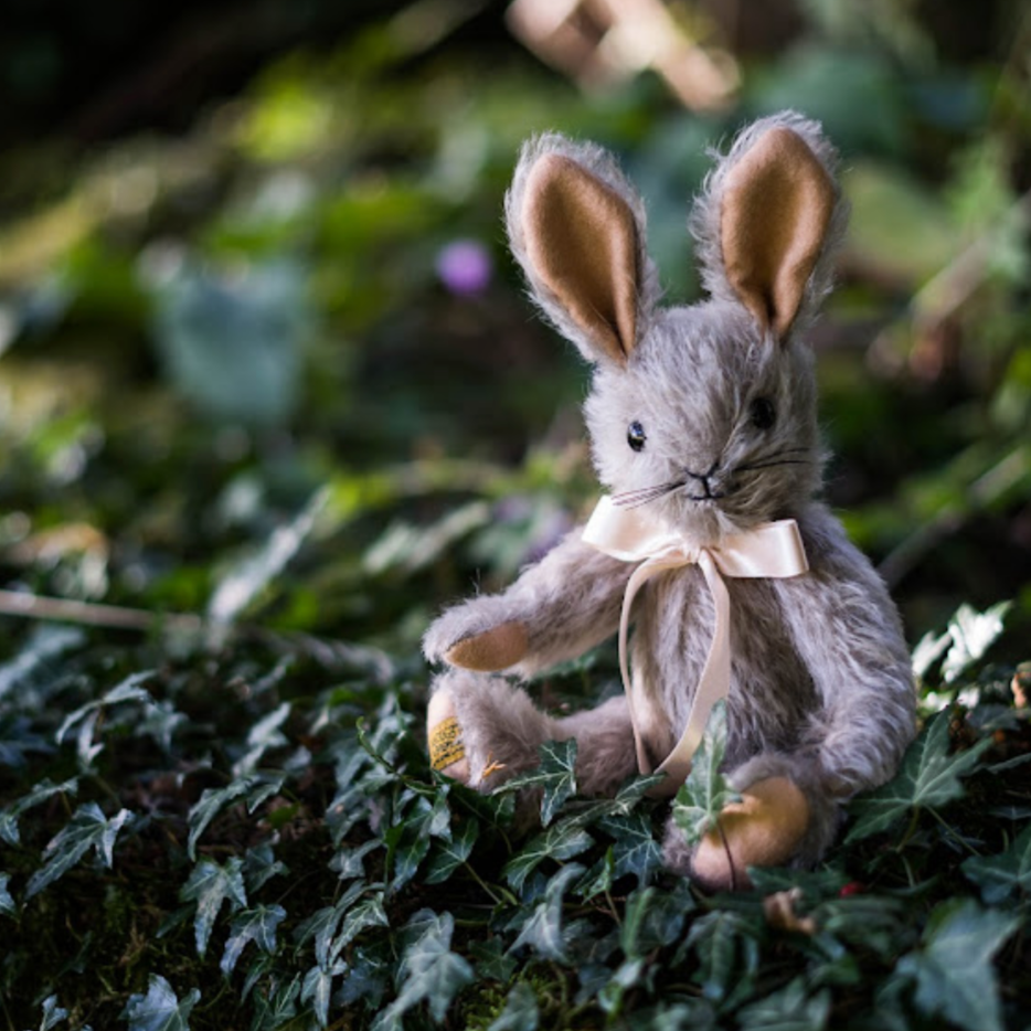 - Handmade from dove-grey mohair, he features slender ears that are lined in pure wool felt, along with an adorable fluffy white mohair bobtail that perfectly co-ordinates with his cream satin bow.