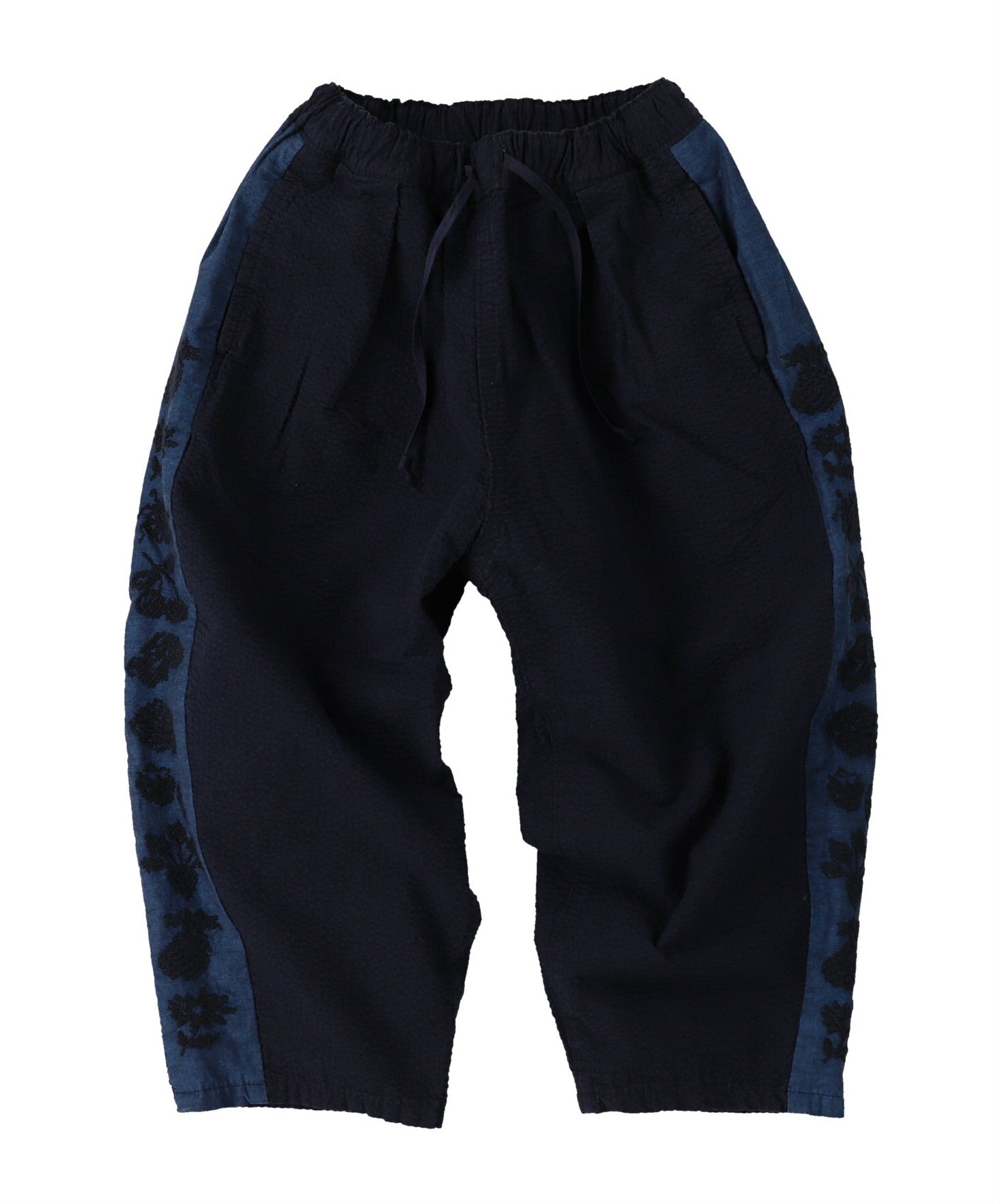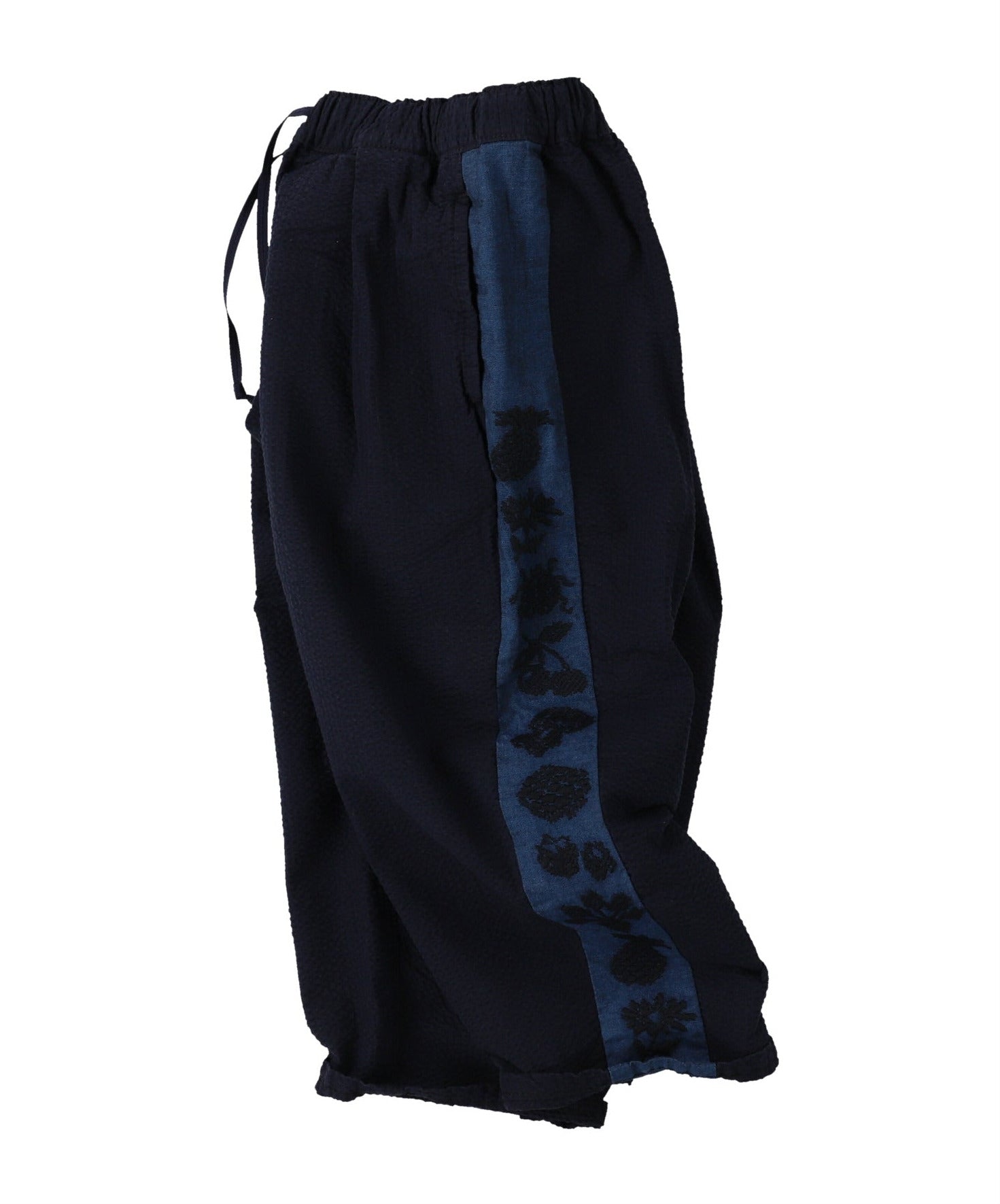 - Cotton seersucker relaxed pant with wide embroidered details down outer leg