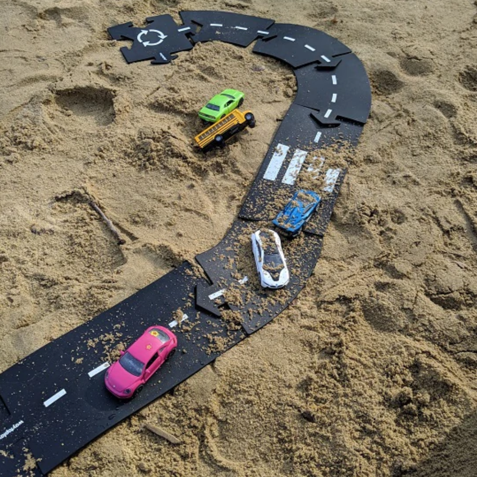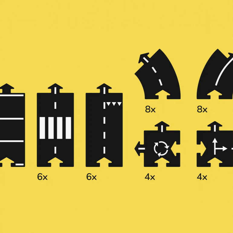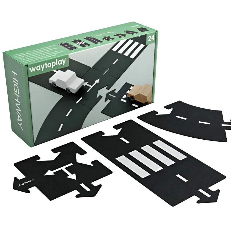 - Highway - 24 flexible road parts to lay-out a larger design road of 148 inch length. The shape of the parts are straight, curved and crossed with different road markings on both sides to for lots of variation